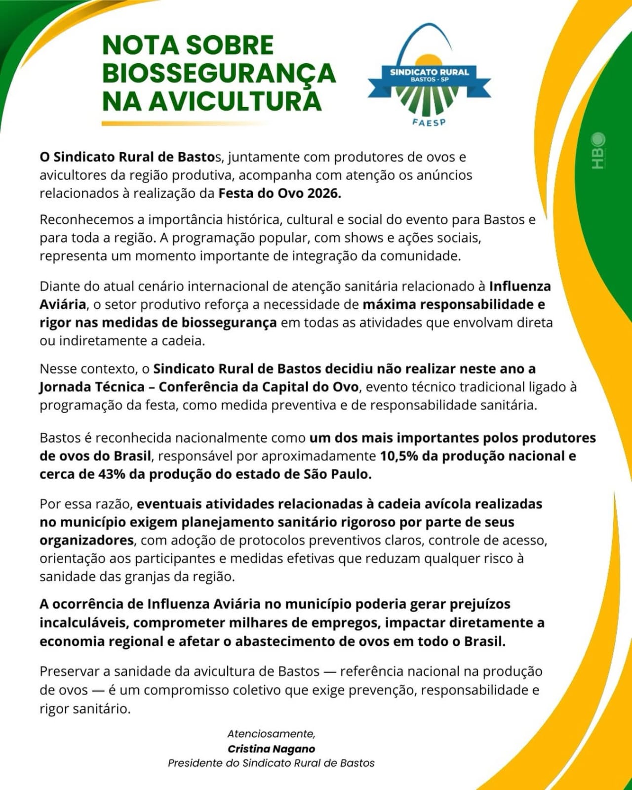 A nota intitulada “biossegurança na avicultura” e assinada pela presidente do Sindicato Rural, Cristina Nagano confirma a reportagem sobre impasse envolvendo as atitudes do chefe do Executivo e o setor produtivo de ovos. Saiba mais: IMPASSE: avicultores queriam Festa do Ovo em março