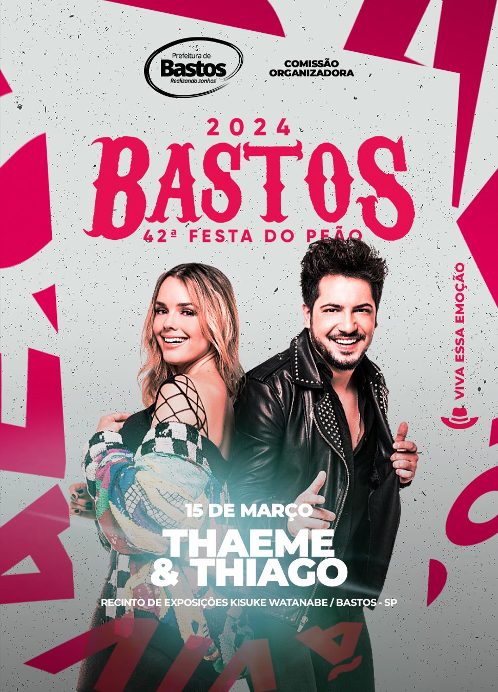 A Prefeitura de Bastos (SP) divulgou na noite desta quarta-feira (21), a agenda do show da Festa do Peão, de 14 a 17 de março. Além dos quatro shows musicais, o evento conta ainda com tradicional rodeio em touros, Parque de Diversão, Praça de Alimentação, entre outras atrações.