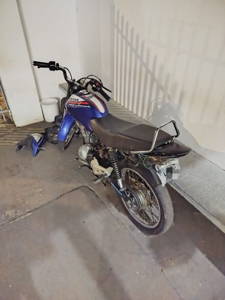 Já no quintal da residência, foi encontrada uma motocicleta parcialmente depenada. Ficou constatado que o veículo apresentava adulteração nos sinais de identificação, já que o motor pertencia a uma CG 160 Titan, ano 2017, enquanto a placa correspondia a uma CG 125 Titan, ano 2005.