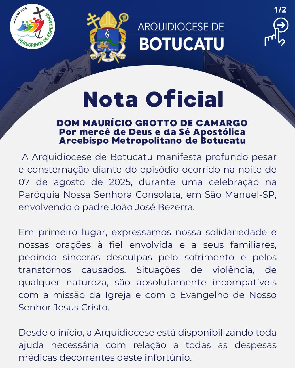 A reportagem entrou em contato com a Cúria de Botucatu, que emitiu uma nota sobre o episódio. O Arcebispo de Botucatu, Dom Maurício, também se manifestou. Confira as notas.
