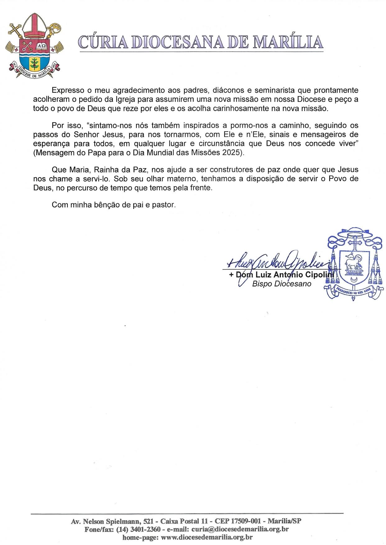 Outras comunidades católicas receberão ainda os padres: Jean Pedro de Jesus de Paula (São José) e Paulo Joaquim de Souza para a Paróquia Senhor Bom Jesus de Arco-Íris. Veja abaixo o comunicado completo da Diocese de Marília e a relação das alterações paroquiais da região.