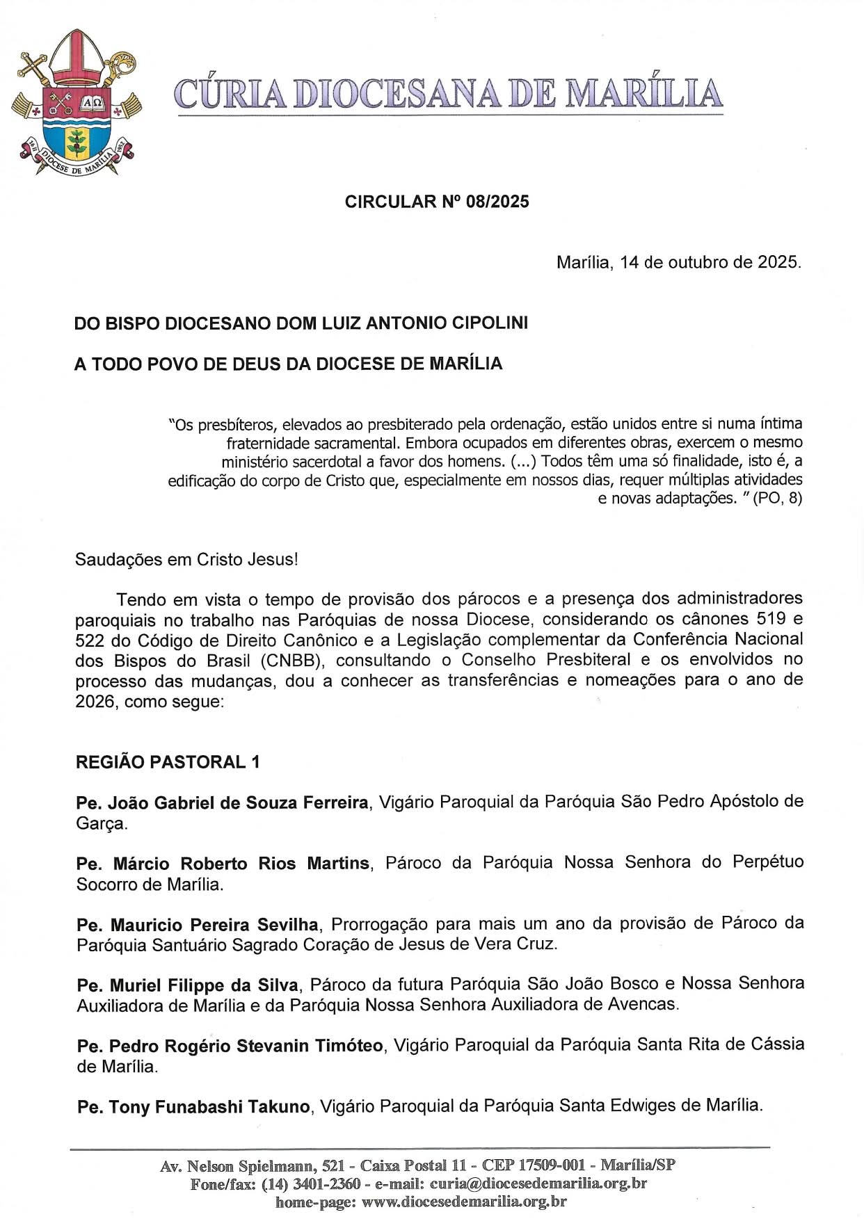 A Cúria Diocesana de Marília (SP) divulgou nesta terça-feira (14), o processo de transferências de padres para atuarem em outras cidades.
